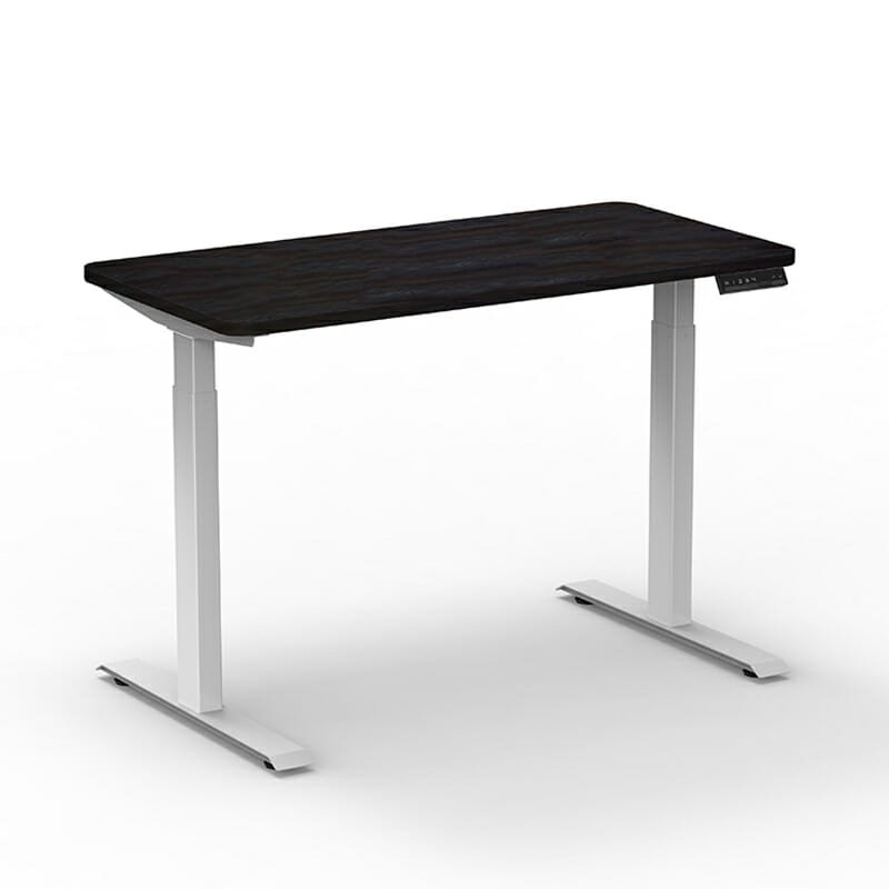 Mesa con regulación de altura eléctrica, base metálica blanca y acabado moderno