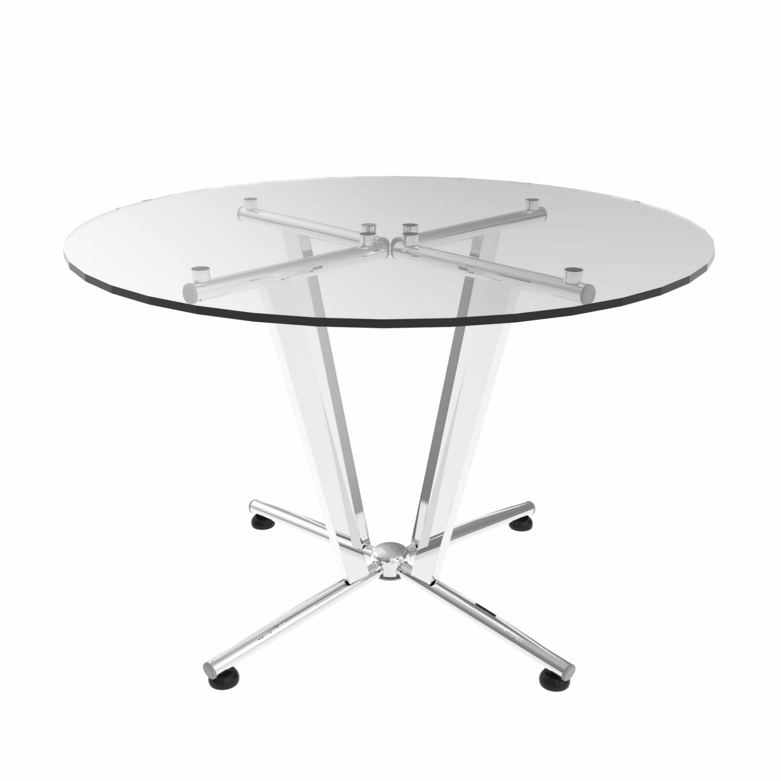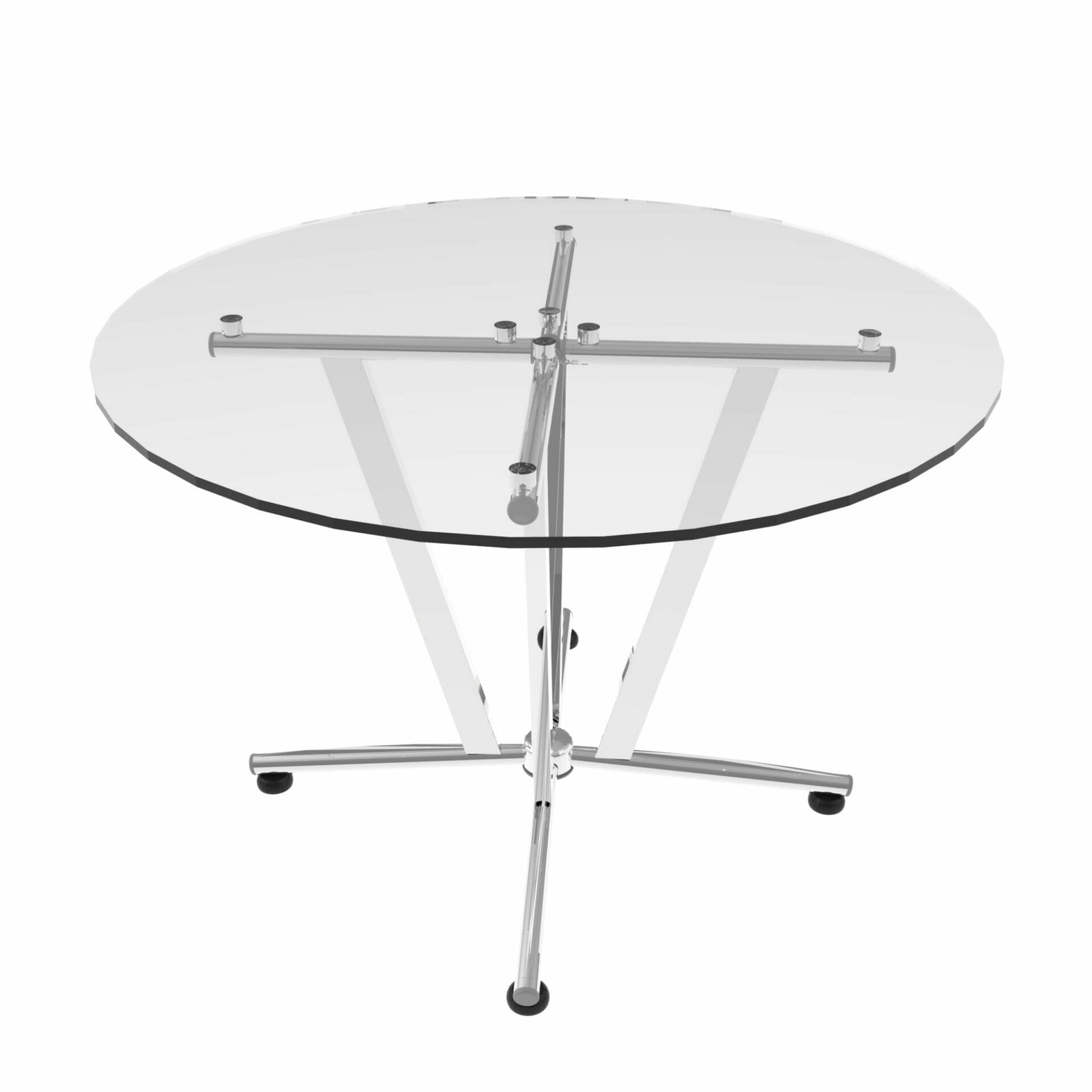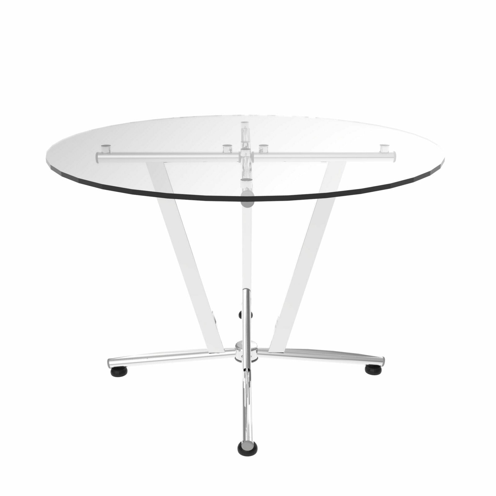Mesa redonda con cubierta de cristal templado de 110 cm. Ideal para áreas comunes en oficinas modernas. Base cromada resistente.
