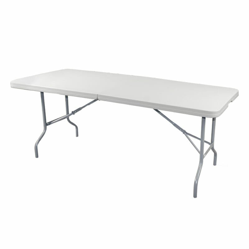 Mesa plegable de dos secciones con asa para fácil transporte.