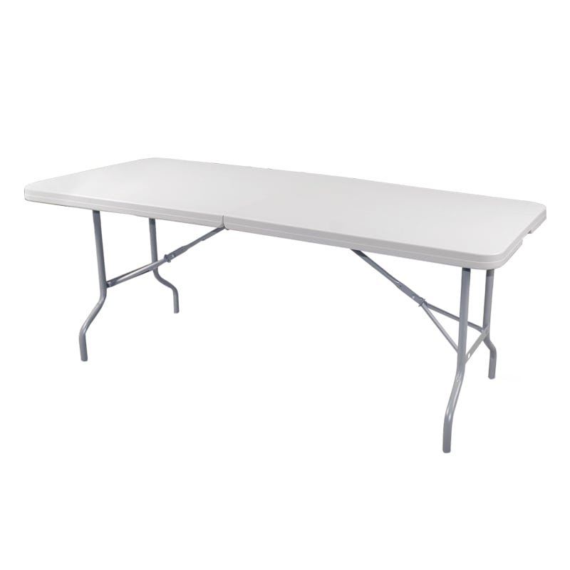 Mesa plegable rectangular con doble sección y diseño robusto.