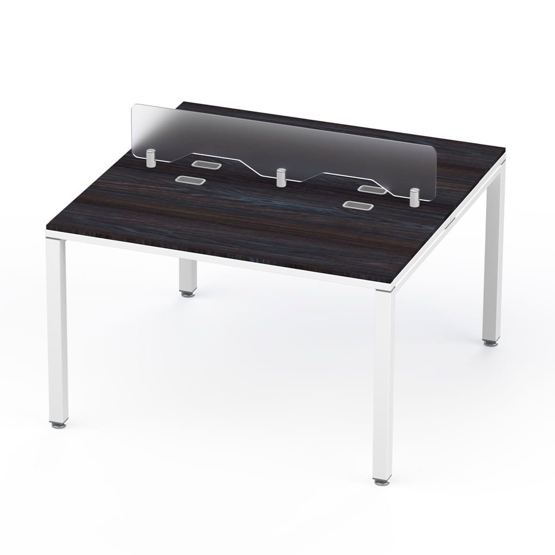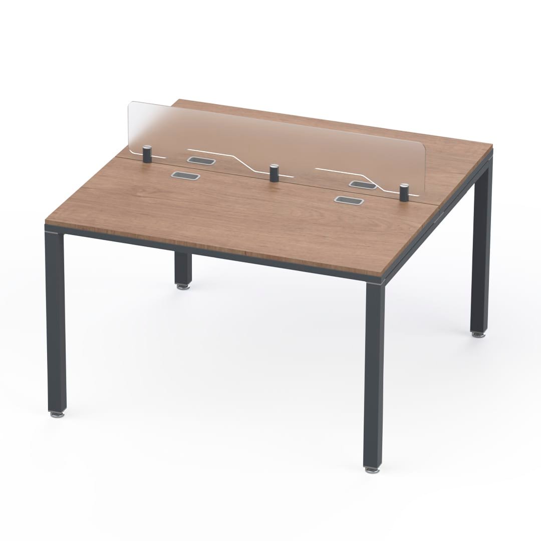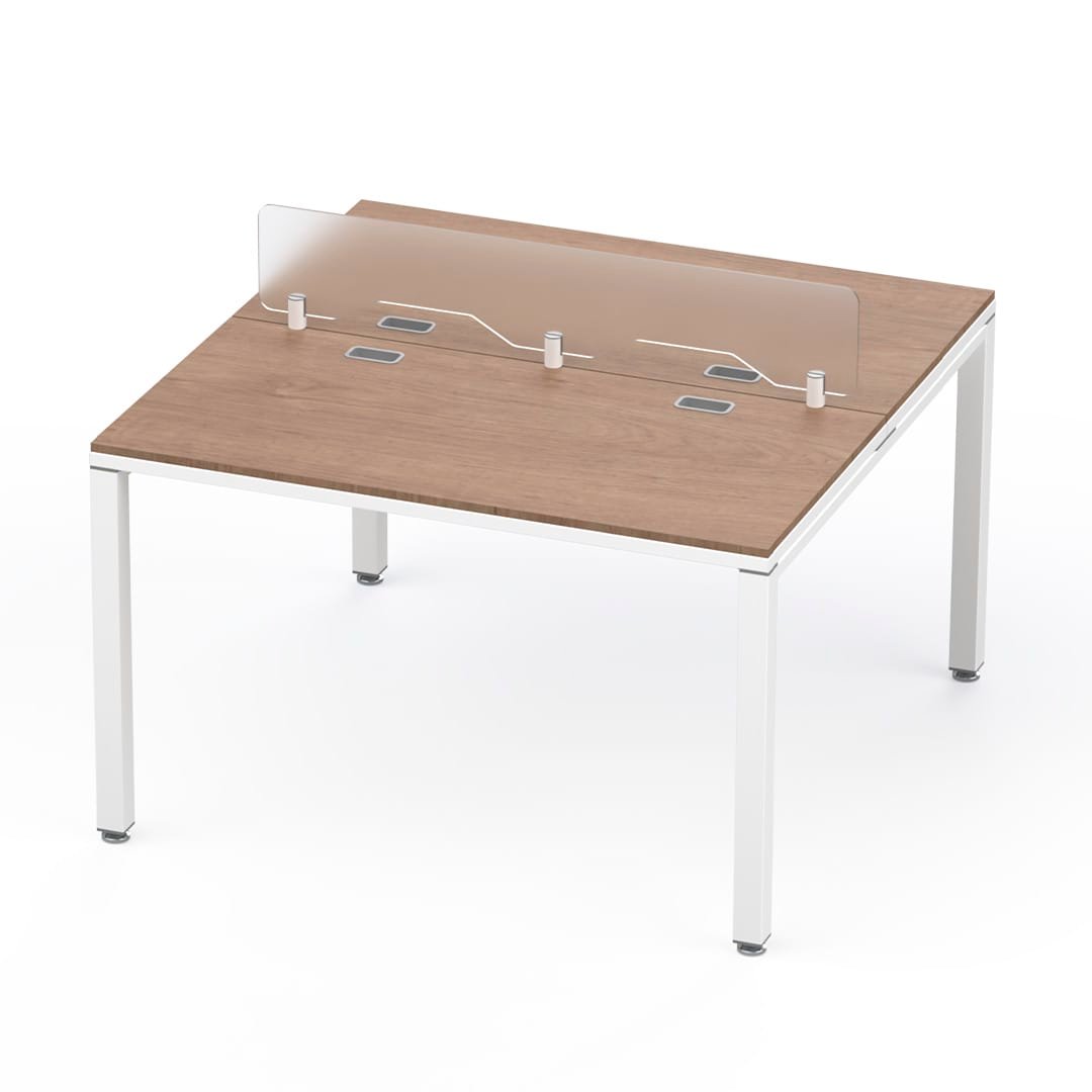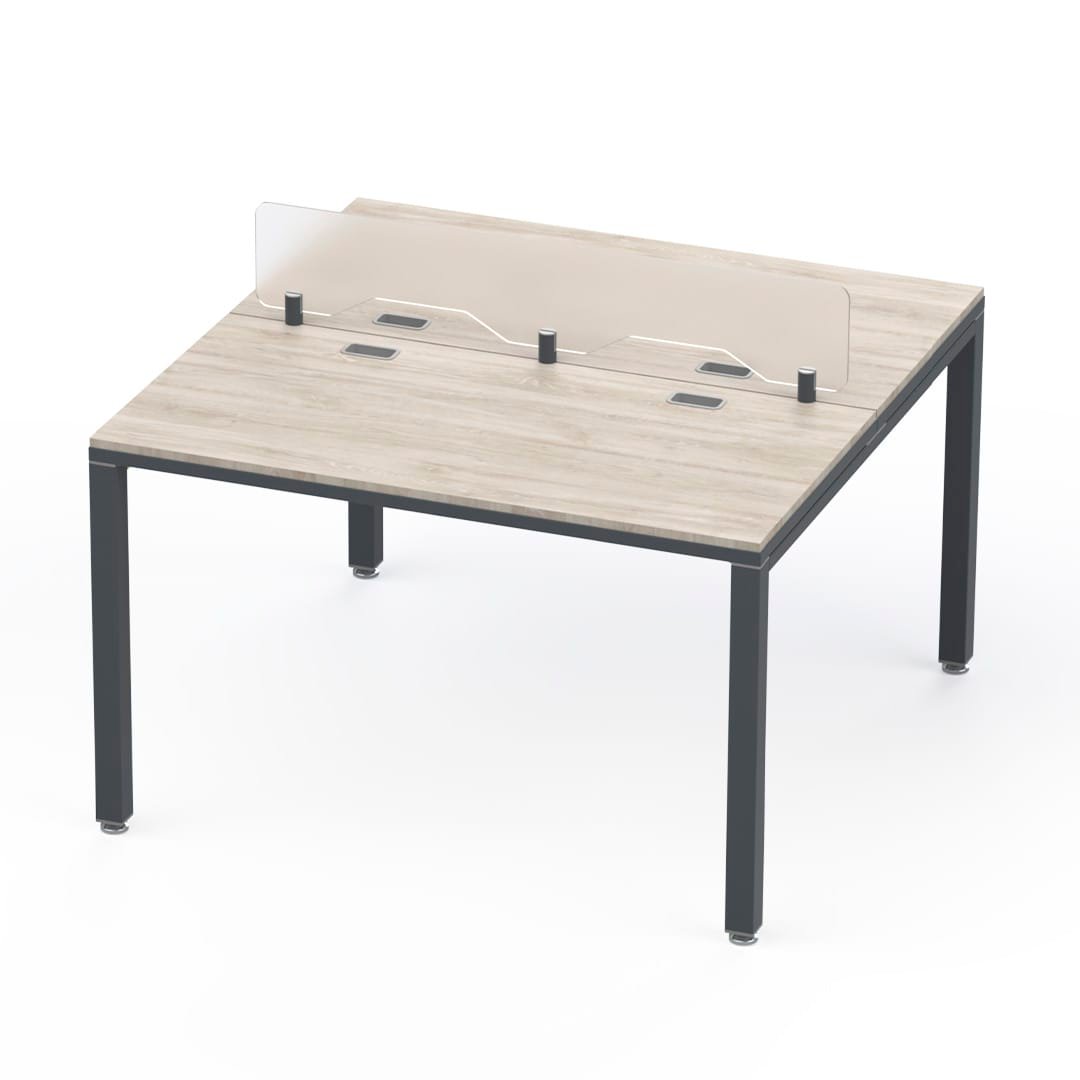 Estación de trabajo doble diseñada para oficinas modernas que requieren funcionalidad y aprovechamiento del espacio. Incluye mampara de acrílico para mayor privacidad y pasacables para organización eficiente.