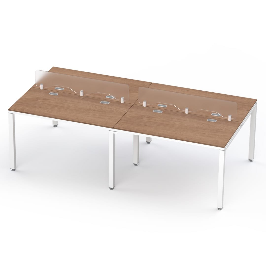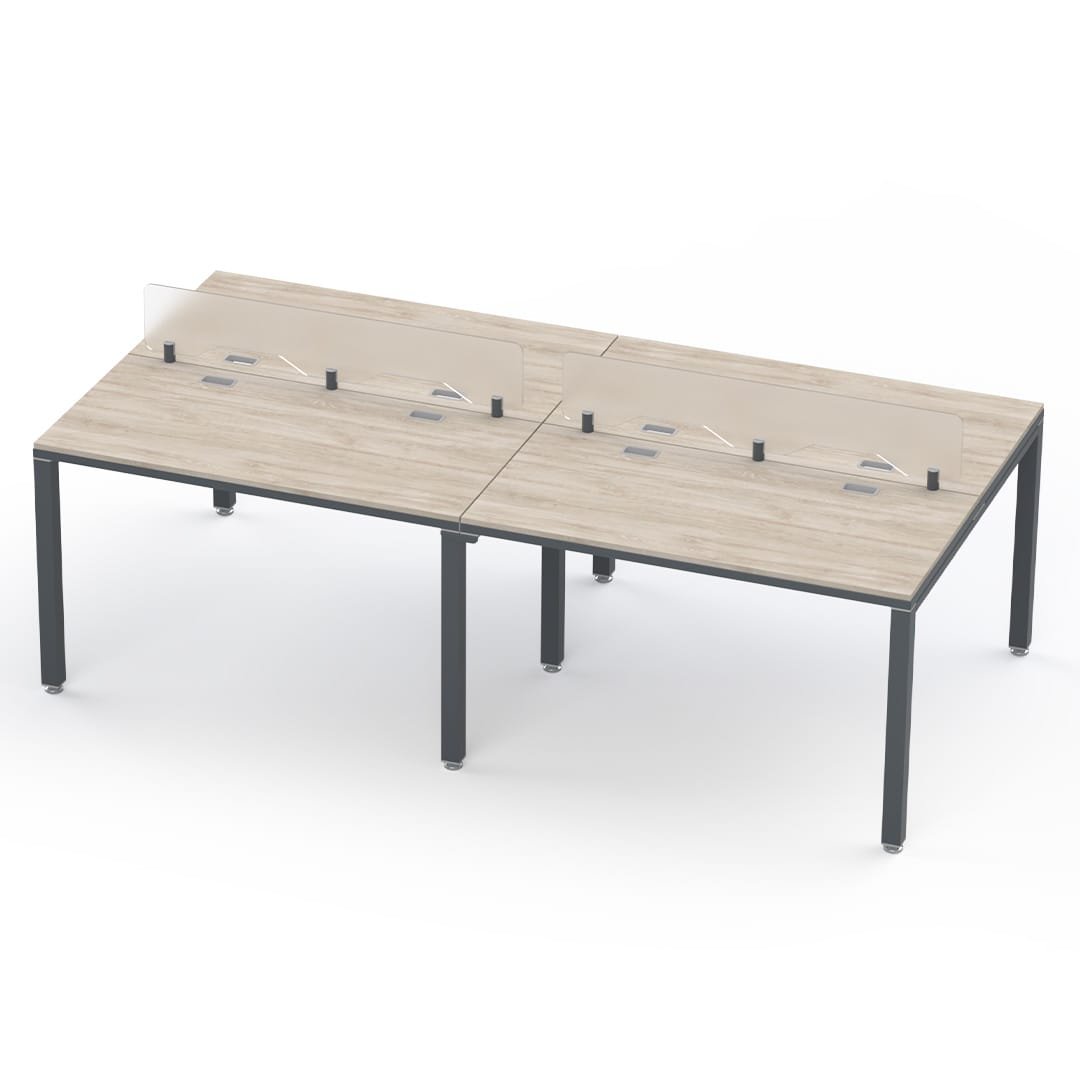 Estación de trabajo para 4 usuarios ideal para call centers y oficinas operativas. Cuenta con mamparas divisorias de acrílico, estructura metálica resistente y una distribución eficiente del espacio.