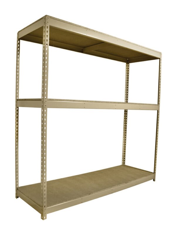 Rack metálico industrial de gran capacidad con 3 repisas ajustables de aglomerado, diseñado para cargas extremas. Soporta hasta 900 kg por nivel y es ideal para almacenes o líneas de producción.