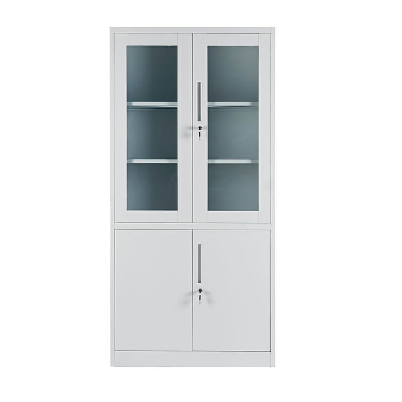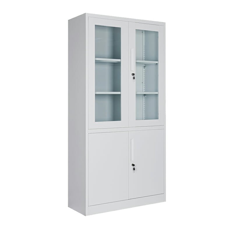 Este gabinete cuenta con dos secciones: la parte superior con puertas de vidrio de 5 mm para exhibición y la parte inferior con puertas metálicas para resguardo seguro. Fabricado en lámina rolada en frío calibre 22, incluye cerraduras independientes con llaves. Es ideal para oficinas, clínicas o instituciones educativas.