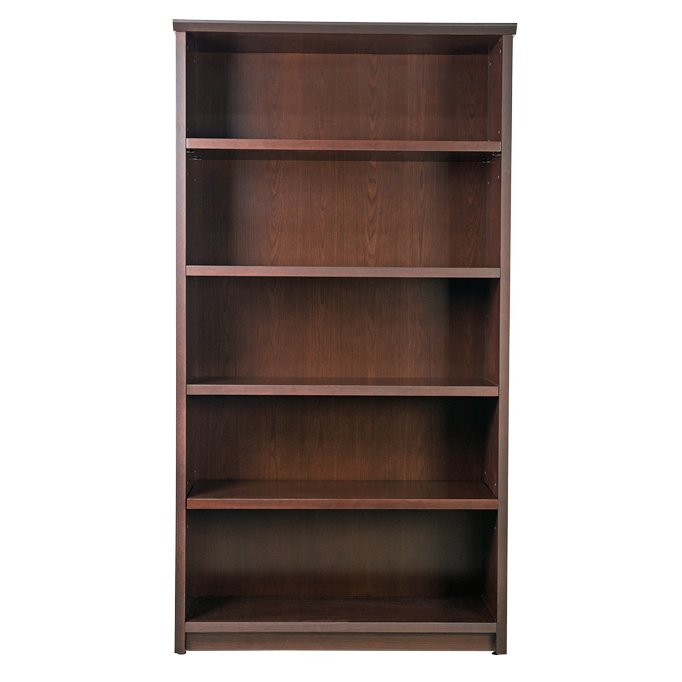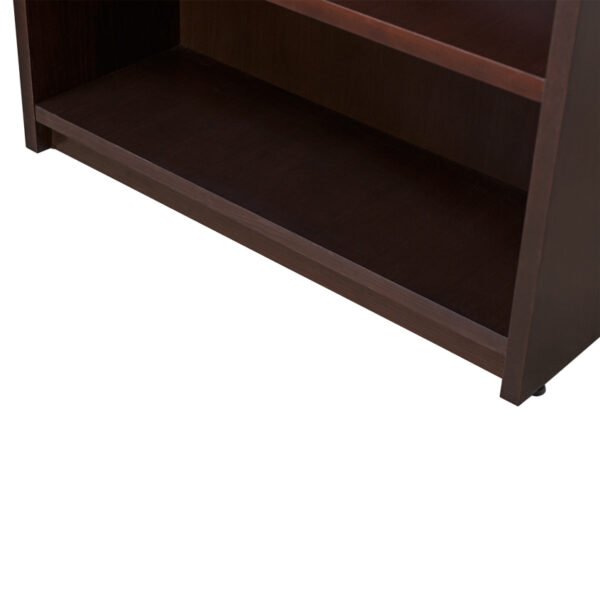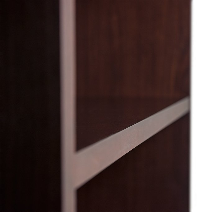Librero abierto alto de diseño elegante, ideal para oficinas ejecutivas. Ofrece múltiples niveles de almacenamiento y acabado en chapa Walnut tono Wengue.