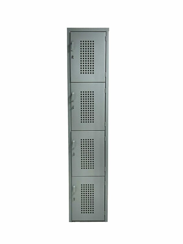 Locker metálico de 4 puertas perforadas, resistente y funcional, perfecto para oficinas, escuelas y gimnasios que requieren organización y ventilación.