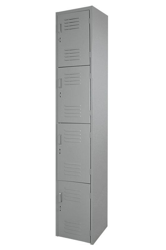 Locker metálico de 4 puertas tipo rejilla, ideal para almacenamiento seguro y ventilado en ambientes escolares o laborales.