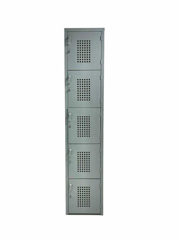 Locker metálico de 5 puertas perforadas, compacto y seguro, ideal para espacios compartidos que requieren máxima ventilación y organización.