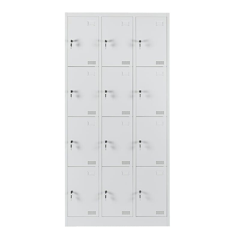 Locker metálico de 12 puertas en color blanco, ideal para optimizar espacios en oficinas, fábricas o gimnasios. Disponible en presentación desarmada.