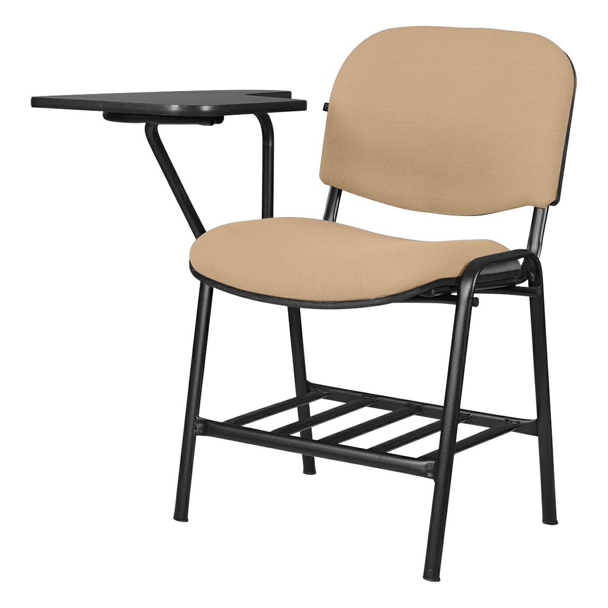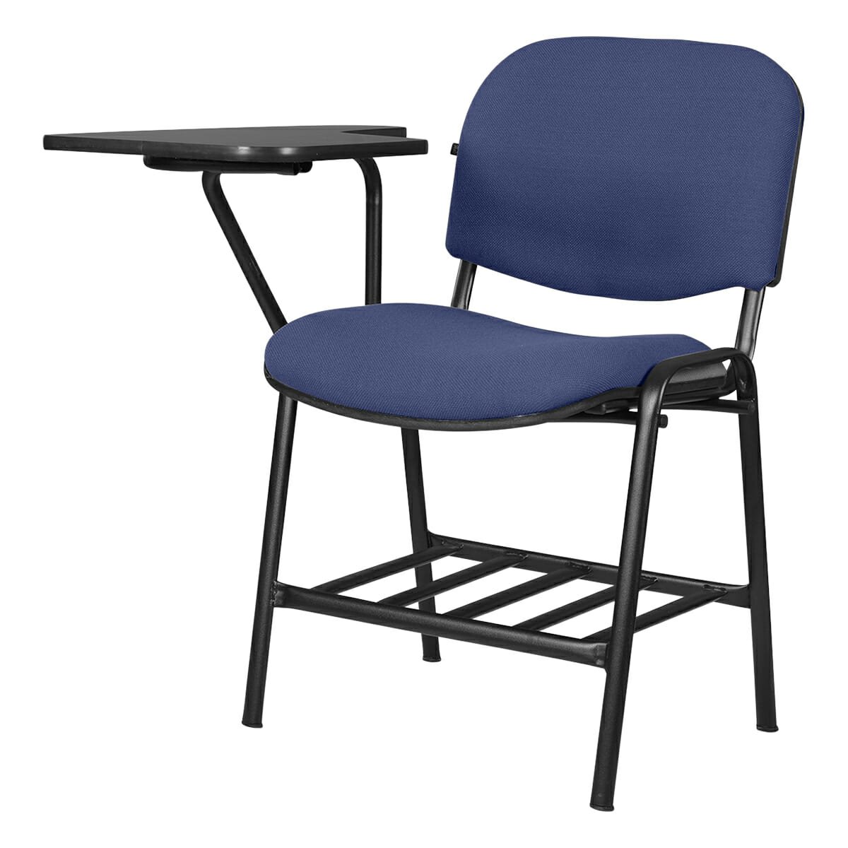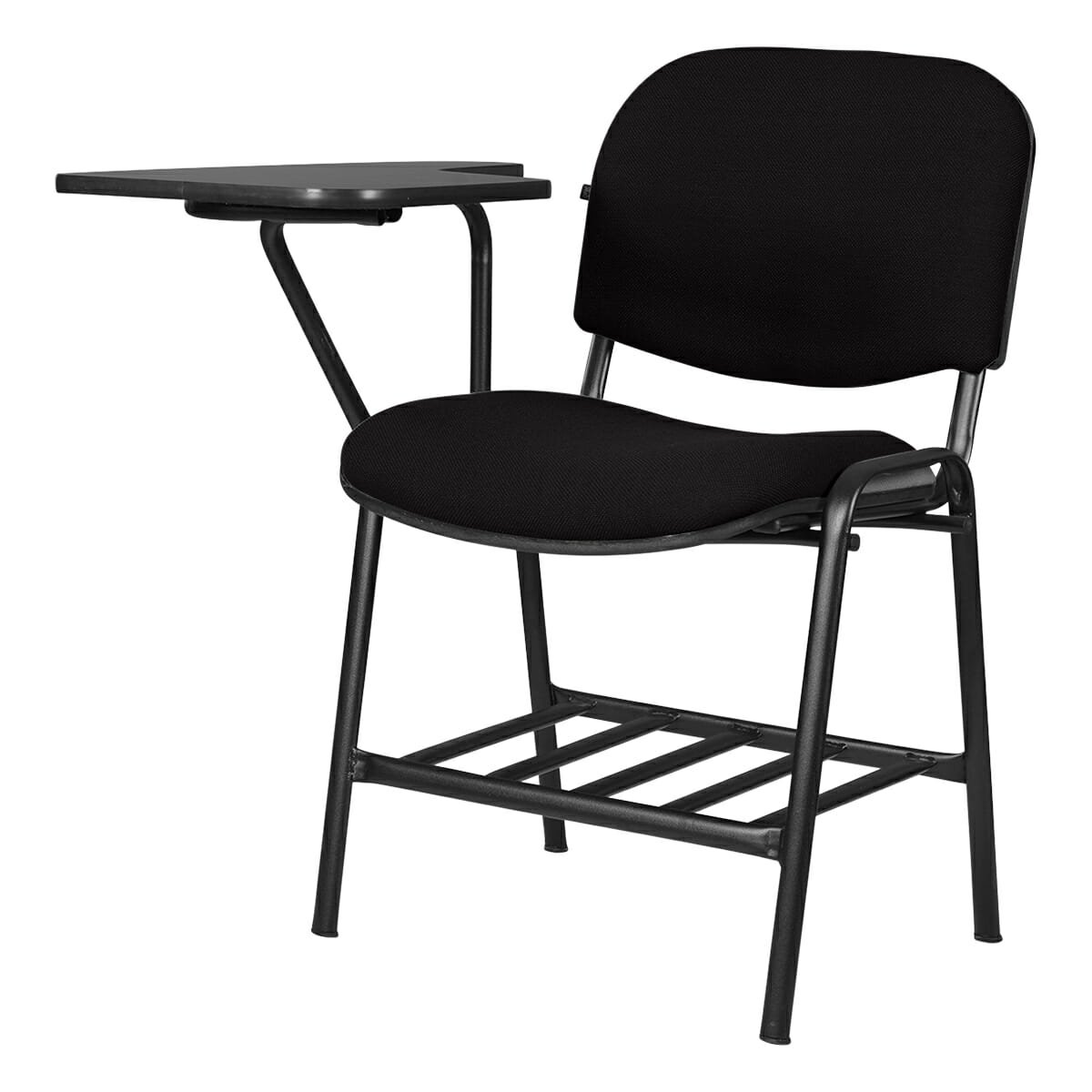 Silla tipo mesabanco tapizada, con estructura metálica y portabooks