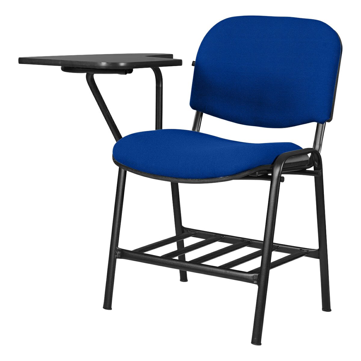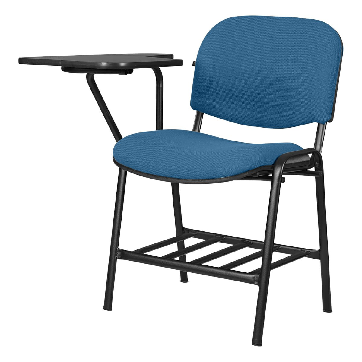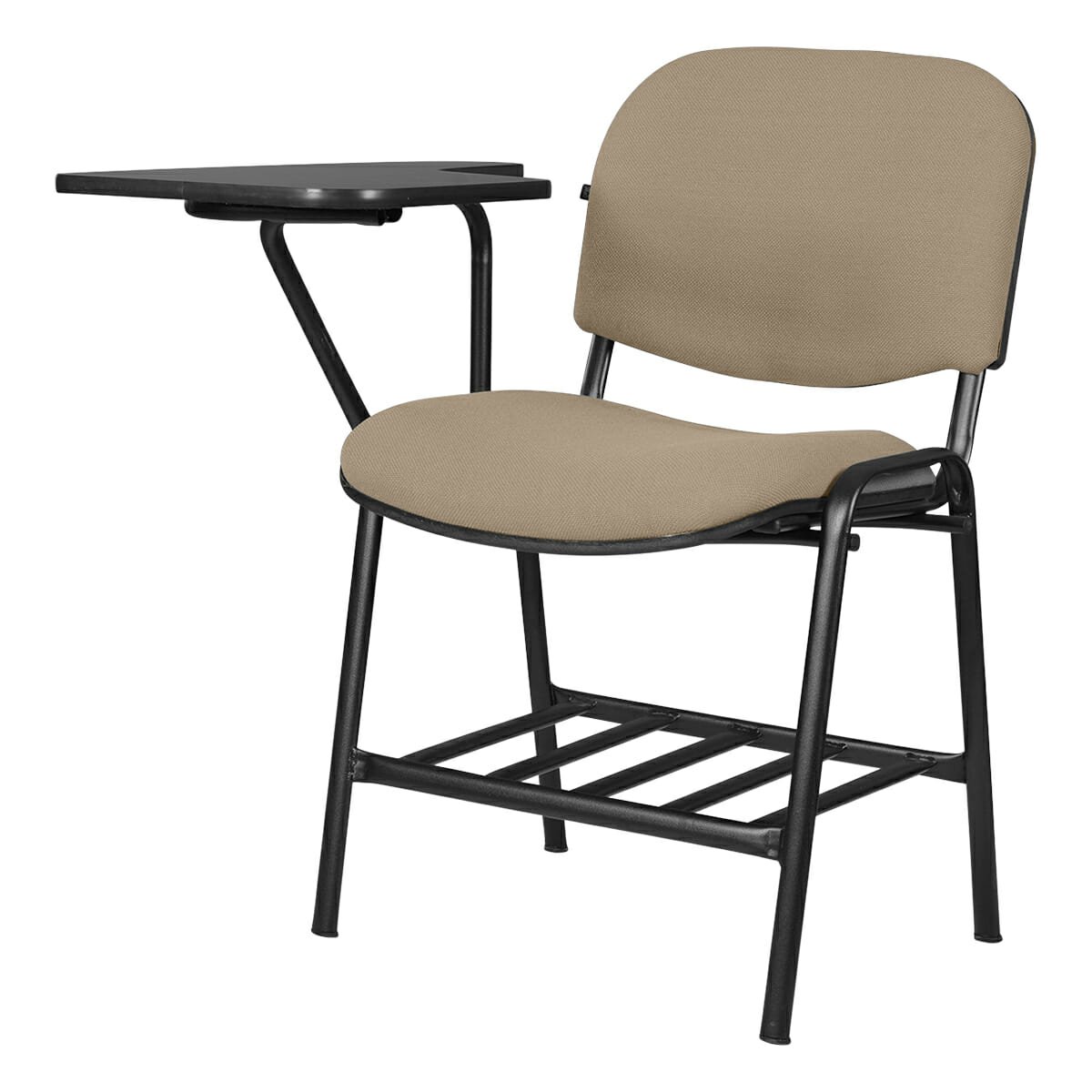 Silla tipo mesabanco tapizada, con estructura metálica y portabooks