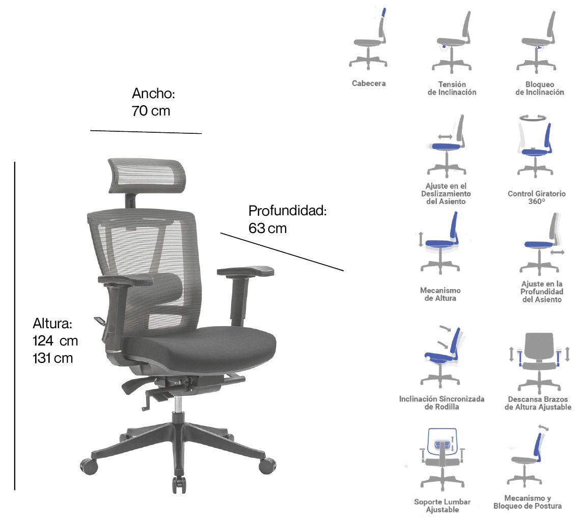 | Respaldo | Ajustable, Alta, Con Cabecera, Con Soporte Ergonómico, Con Soporte Lumbar |