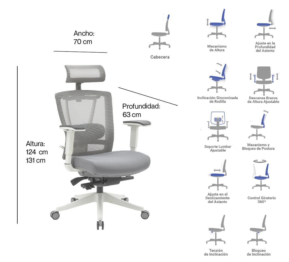 | Respaldo | Ajustable, Alta, Con Cabecera Fija, Con Soporte Lumbar |