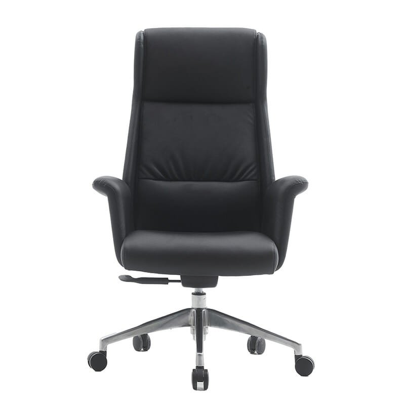 Silla ejecutiva moderna tapizada en vinipiel negra, con respaldo alto, brazos acolchonados y base cromada. Ideal para oficinas directivas.