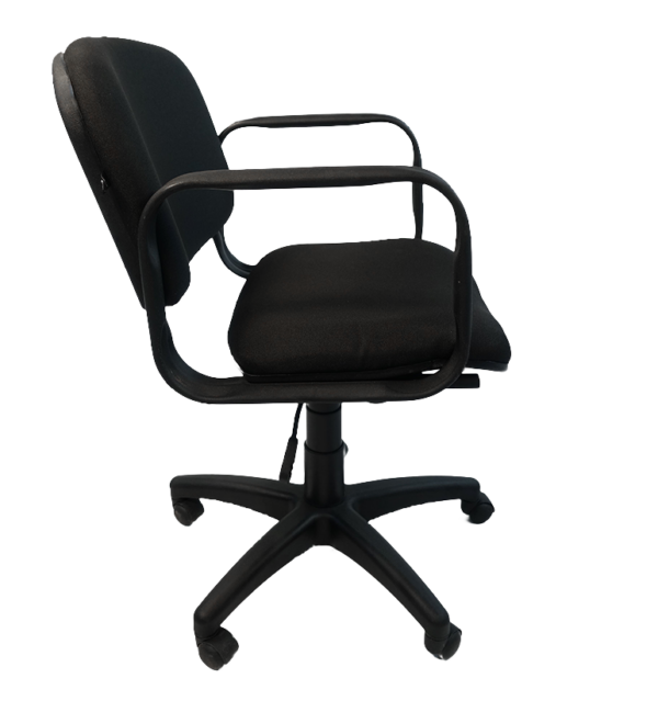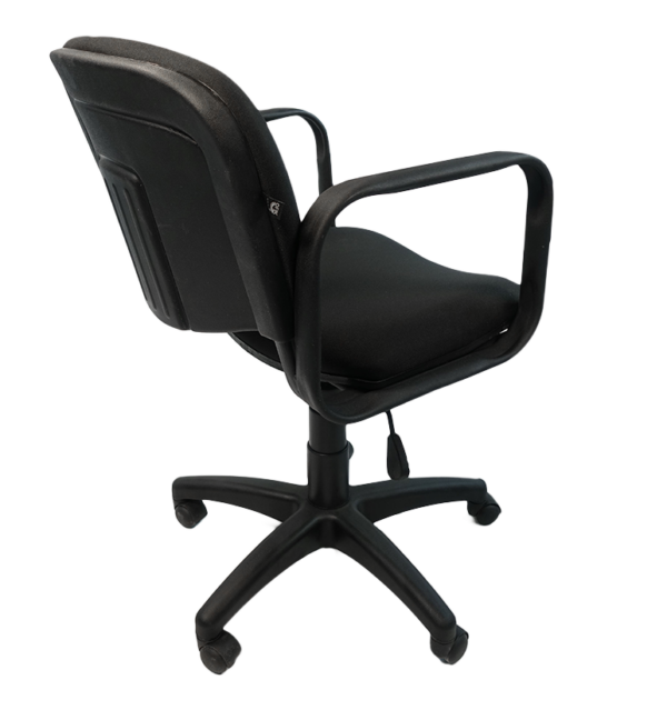 Silla de oficina con brazos fijos, respaldo medio y base giratoria.